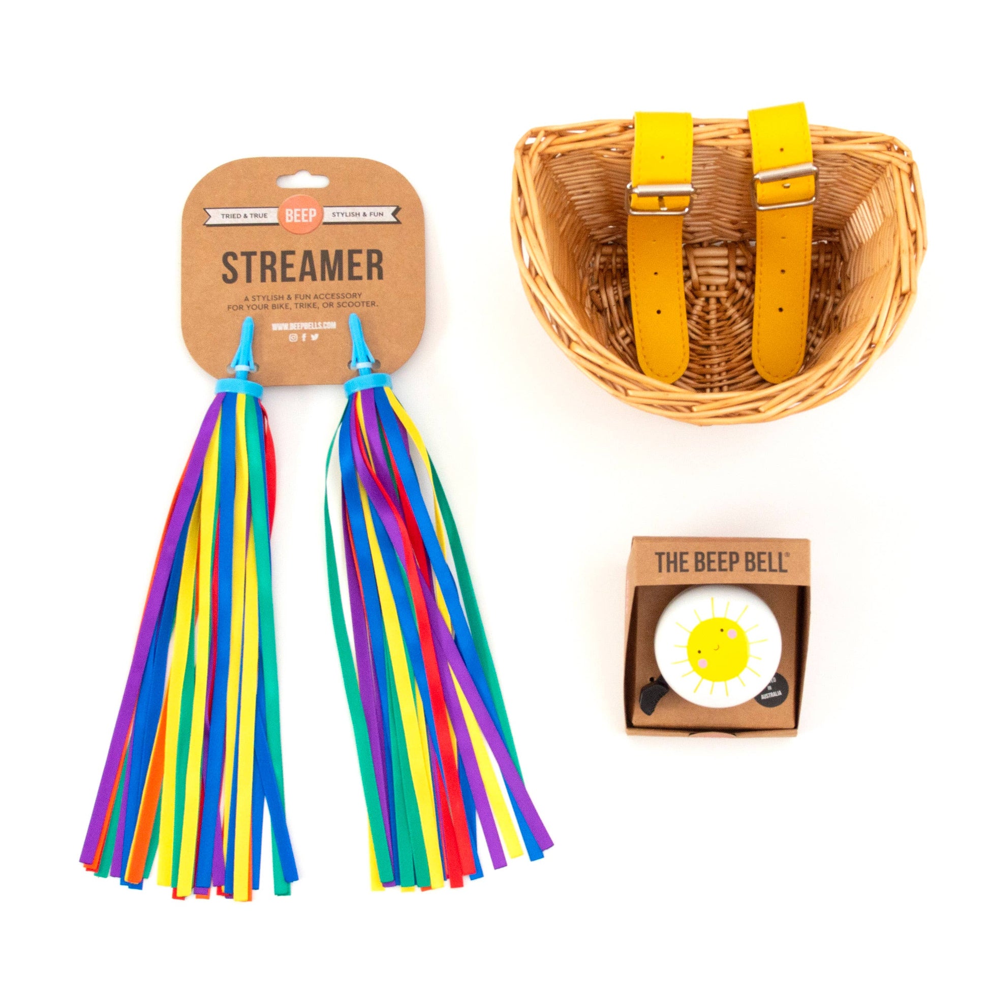 Pure happiness for your handlebars. Printed in Australia with eco-friendly weatherproof inks, this happy Beep Sunshine Bike Bell features a super cute smiling sun design on a white bell. The friendly sound of this Beep bike bell means everyone will know you’re coming through! The Beep Sunshine Bicycle Bell is the perfect way to personalise your ride and makes a unique gift for anyone with a bike, trike, or scooter. The Sunshine Bell pairs beautifully with our Kids Wicker Basket with Yellow straps and Ocean Blue Streamers.