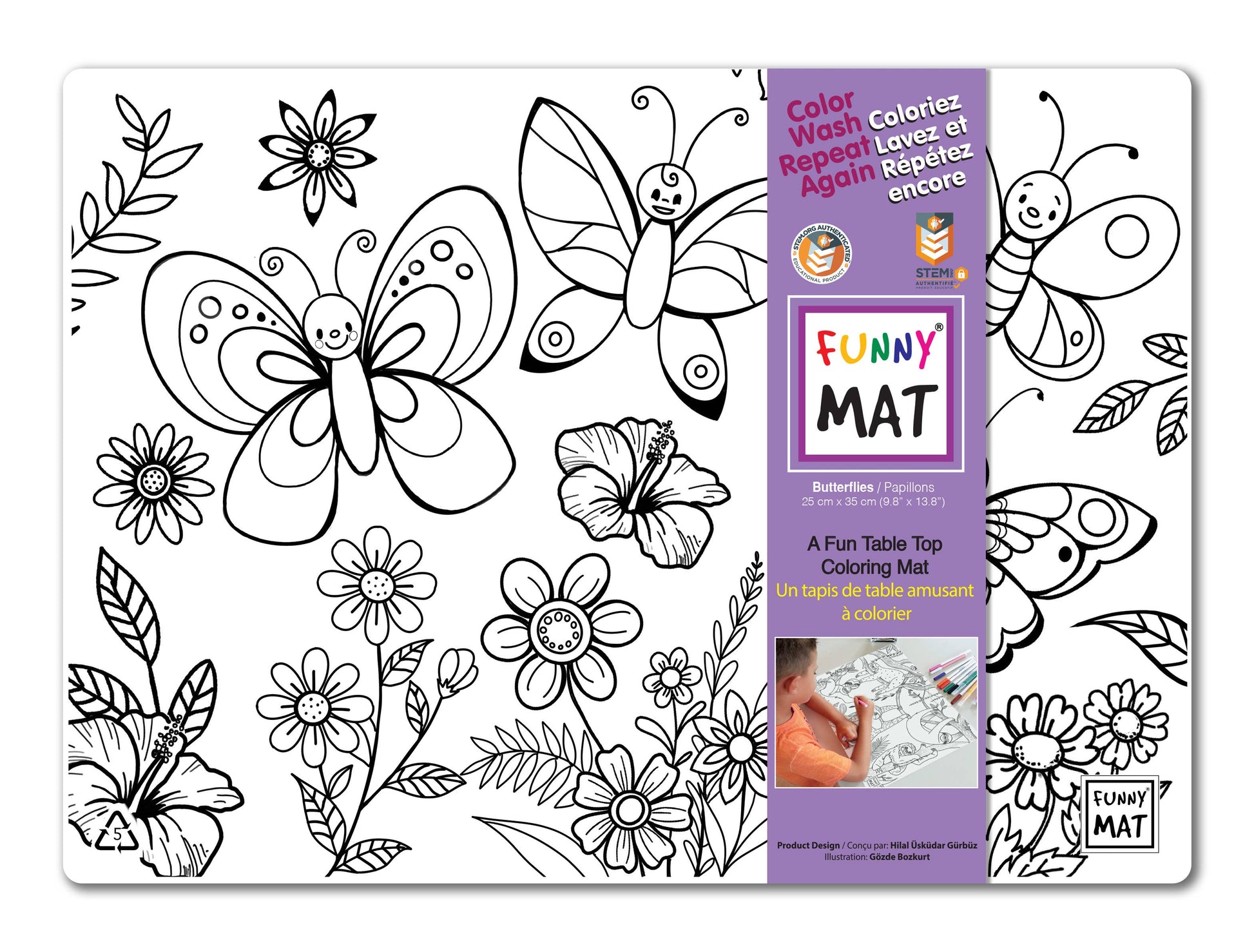 Funny Mat is a table top cover that can be used for craft projects such as drawing, coloring or as a protective mat for painting, plasticine and play dough or as a placemat. The designs on Funny Mat can be colored with water-based, washable markers. Funny Mat is made of polyproylene and is recyclable and reusable.