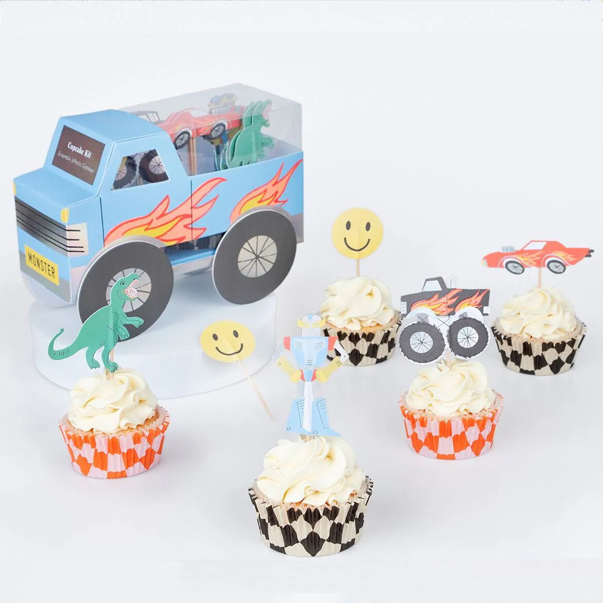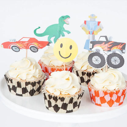 - The cupcake toppers include 5 designs of a monster truck, a car, a robot, a T-rex and a smiley face
