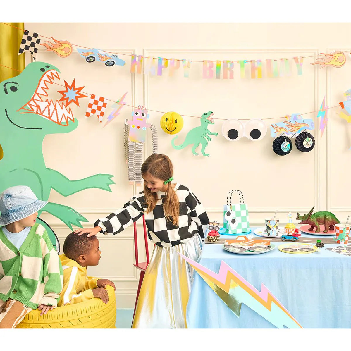 Brumm, brumm! Monster trucks are perfect to give a fun vibe to a special birthday party. This paper truck is filled with iconic retro toy cupcake toppers, and checked cupcake cases, to make the most fun and tasty treats. Place the truck, and the cupcakes, on your party table as a centerpiece to delight the birthday boy or girl and their guests. The kit also makes a great gift for kids who love to bake.