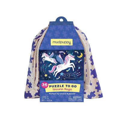 Mudpuppy's Unicorn Magic Puzzle to Go features two magical unicorns. Packaged in a travel-friendly drawstring bag, puzzling on the go has never been so easy! The finished puzzle fits on an airline or train tray table.