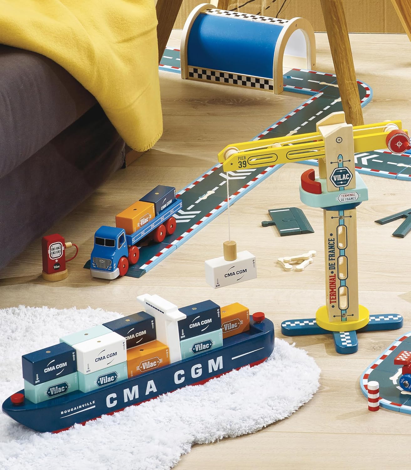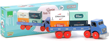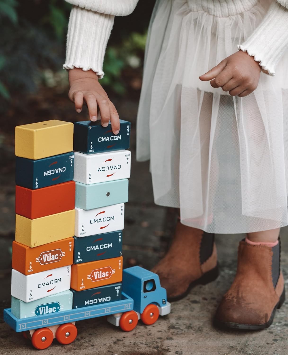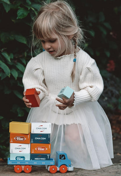 The Vilac Vilacity Wooden Container Truck carries 4 magnetic containers, which are compatible with the small crane (sold separately). Now your child can drive the Vilac Truck and make deliveries from port to warehouses. Wooden vehicle toys are a great role-play for children to make up stories. This wooden truck from Vilacity Collection is a perfect gift idea for the development of fine motor skills and imaginative play.