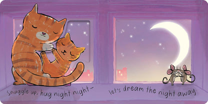 Join a snuggly cast of baby animals from around the world as they settle down for the night. Turn the pages to see them hug night night in this bedtime board book with cleverly shaped pages and peek-throughs transforming each page. Adorable illustrations of bears, otters, cats, and more parent/child pairs depict the animals on separate parts of the page on the initial spread, but with a turn of the sturdy board flap, the two are brought together in sweet embraces. Perfect for sharing with a special little one at bedtime, or anytime!