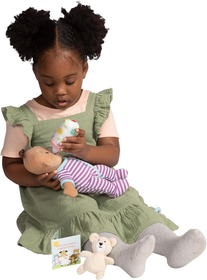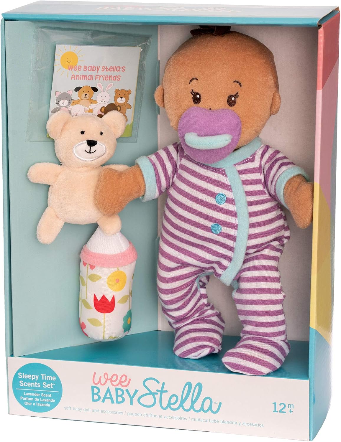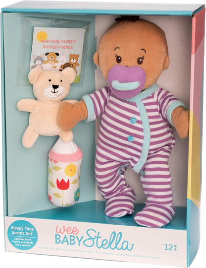 Soothing scents and sleepy attire, the Sleepy Time Scents set is the perfect cuddle companion for your little one. This bed time themed set features scent technology by Celessence, an innovative micro-encapsulation delivery system - gently hug doll to release her soft lavender scent. This Sleepy Time set comes with a Wee Baby Stella Beige doll, magnetic bottle, soft bear and paper storybook. The 12 inch Wee Baby Stella dolls are completely soft and beautifully crafted with details such as a belly button and perfectly plump tummy.